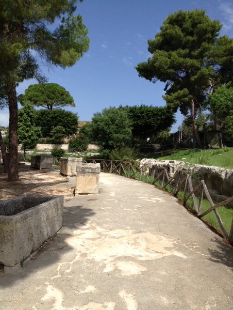 The path to the amphitheater has a long line of stone sarcophagi, empty of course. As you can see the park that contains the ampitheatre and the colosseum is a lovely park.