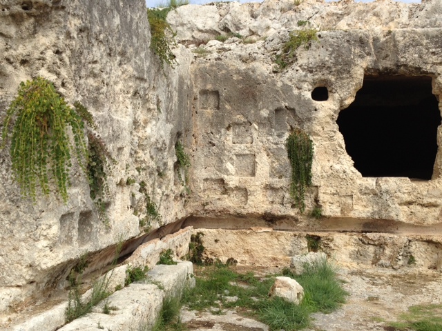 These groves were carved to channel water from the spring (Nymphaeum) to the rest of the complex. This is just above the Greek theatre. They were later used by the Spaniards linked to aqueducts to draw water for their mills.