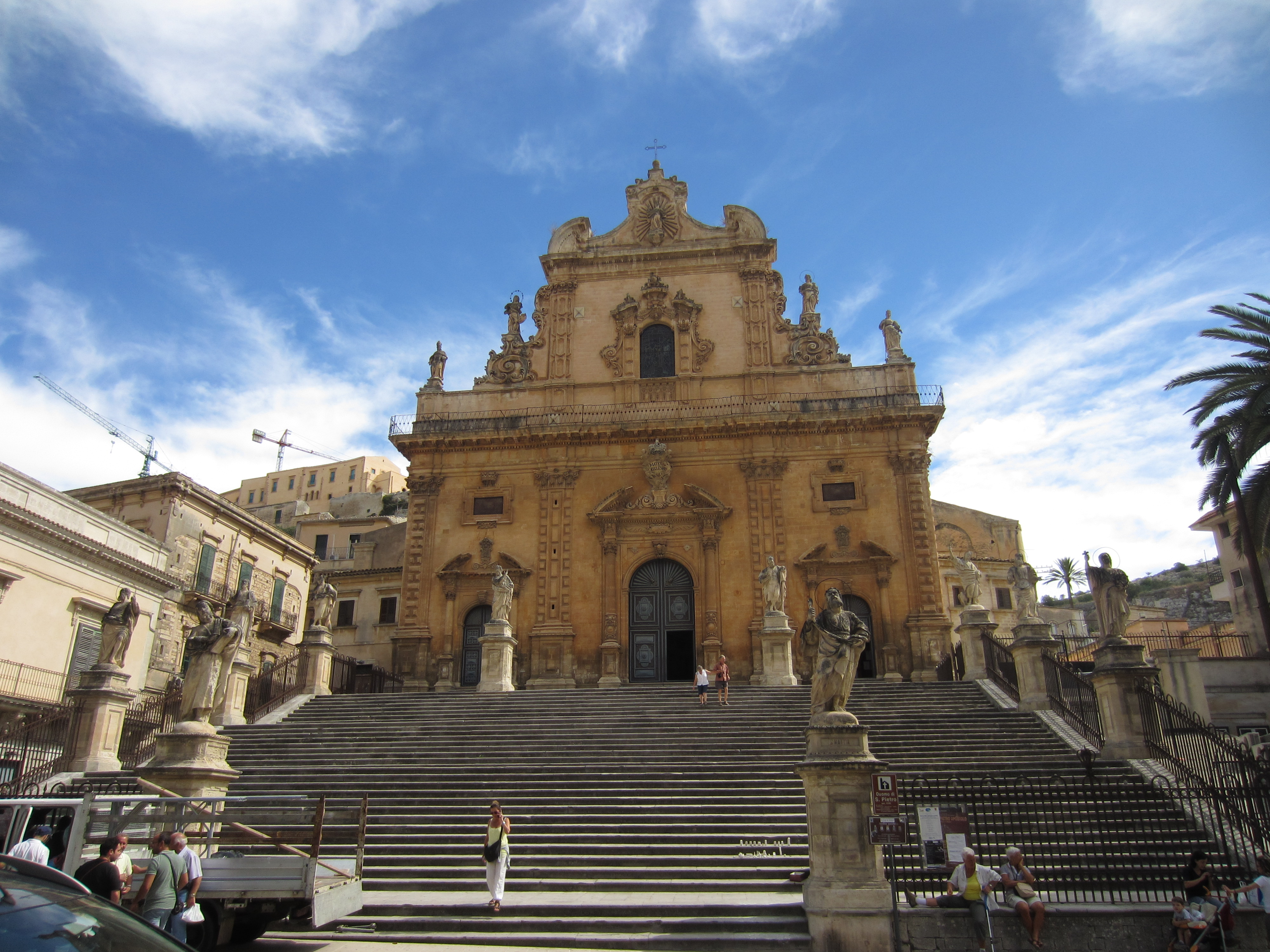 Example of the Baroque style you see in all of the towns in this area. The cranes you see in the background (left) are working on renovating the clock tower and the castle up at the top of Modica Alta.