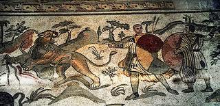 This particular detail is described as Soldier with Swastika (look at his robe). This is one of two long strips one representing Mauritania and the other India. This is a sort of “map of the world” known at that time. Captured wild animals, richly dressed exotic figures, and some ancient architectural landmarks.