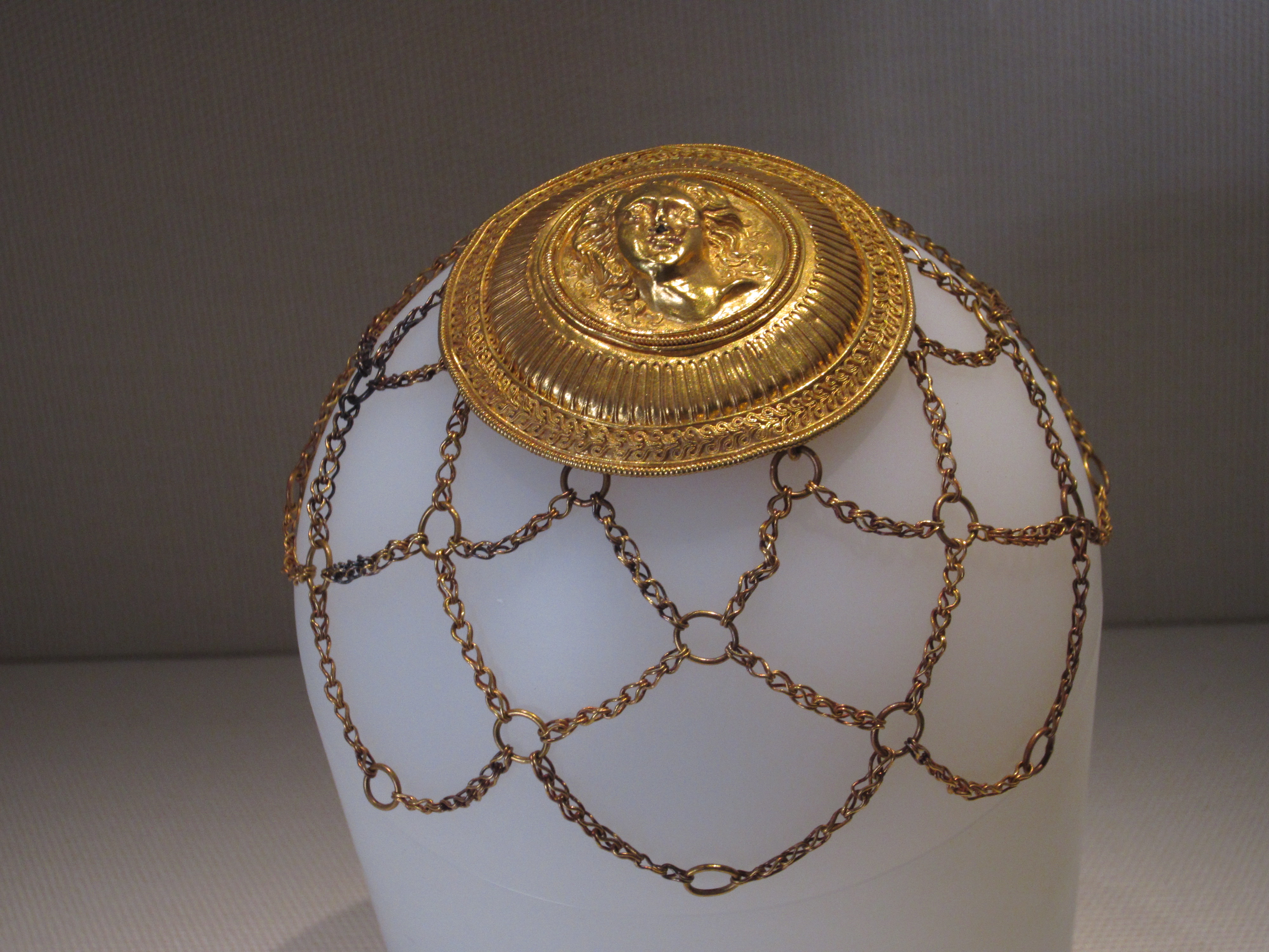 New addition to the collection of the archaeology museum in Agrigento was this beautiful delicate piece that was found in excavations under an ancient Roman house. Apparently, this work was taken by a Roman soldier who hid it along with coins (not photographed) and some other gold jewelry in his house but was killed before he could do anything with them and did not tell anyone so only discovered recently. The technique comes from the ancient Egyptians. For those taking my 1A class, remember the head covering the prehistoric women were wearing? This reminds me some of that.