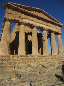 The Greeks entered on the east side of their temples since all rituals were performed in the morning. The inner church entrance was on the opposite side with an apse at this end. The pediment (triangular area) likely had actual sculptures in the time of the Greeks. This temple was built approximately 480 BCE.