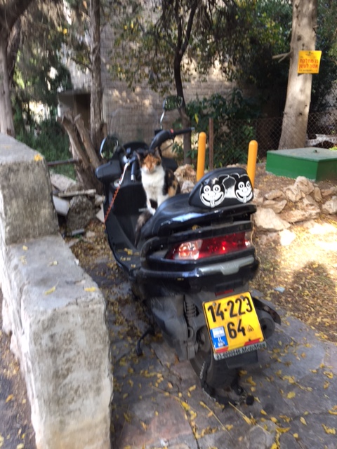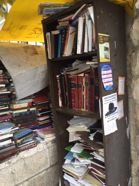 Excellent public transportation and notice that all the buildings are from the same “Jerusalem” stone. It’s hard for us in Northern California to imagine a city built almost entirely from stone.The busiest intersection in Jerusalem. They coffee bar/bakery on the corner makes for good people watching and the great fresco wall mural across the street.Close up of the wall mural.The British brought cats into Palestine at the turn of the 20th century to help with the rodent problem. They did take care of that but now are on their 9th or 10th generation of mostly scrawny and malnourished scavengers. This one looks to be fairly well off.Children go to school 5-1/2 days a week. They are off Friday afternoons and Saturdays. Unlike in the US one sees lots of kids out on their own going to and from school and playing outdoors. Most people in this neighborhood do not have televisions and kids do not play video games so they jump rope, ride bikes, play ball or soccer.Right next to the bus stop is a lending library available to anyone who would like to take one of these books.Most of the men in the neighborhood where black suits and hats with white shirts. Most of the women are also dressed in black. It makes purchasing for a retail store much easier as well as packing for a trip.