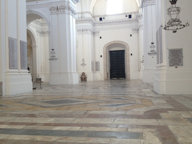 San Nicolo l’Arena church, Catania Posted on September 28, 2013 by mcohen15 This church was empty of pews, chapel furnishings, and filled with dust. The chandeliers are barely hanging on their chains.