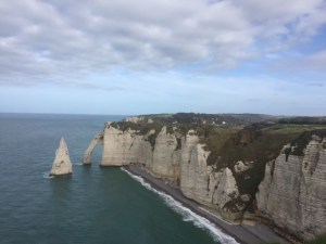 It’s no accident that the white cliffs of Dover are on the other side of the English Channel from Etretat. You will see that these cliffs were the subject of the Impressionists. The crescent shaped bay with fairly calm water once made it a thriving fishing village and ultimately a popular seaside resort (again only a train ride away from Paris) in the 19th century. For the Impressionists having subject matter for Plein Air painting (outside on the site) was one thing that drew them, the amazing light which we understand living on the coast as we do, but also the Impressionists were interested in depicting leisure time. This is the perfect setting for that. Now there is no longer a port except for rental boats so the streets are lined with restaurants, hotels, and knick knack shops but all that does not detract from the natural beauty.